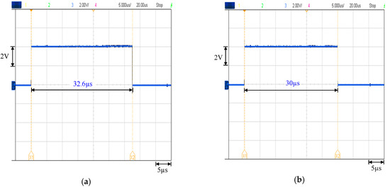 The calculation time of the IT2 T-S fuzzy and the IT1 T-S fuzzy systems is compared in Figure 9a,b. The calculation time of the IT2 T-S fuzzy is 32.6 μs and the calculation time of the IT1 T-S fuzzy is 30 μs. The IT2 T-S fuzzy system requires 2.6 μs more than the IT1 T-S fuzzy system to process the control algorithm. The switching period of the developed system is 50 μs. Therefore, the proposed algorithm is acceptable in implementation.
