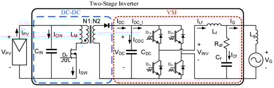 One possible solution to achieve both a good maximum point tracking (MPPT) performance and a reduced THDi is the use of two-stage grid-connected PV inverters, based on a DC-DC converter connected to the PV source, followed by a grid-connected inverter [,,]. This paper focused on this kind of topologies.