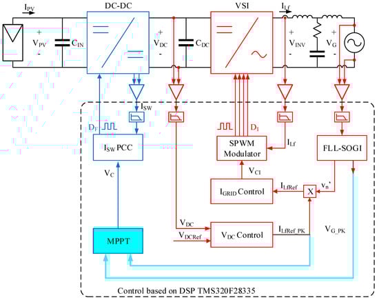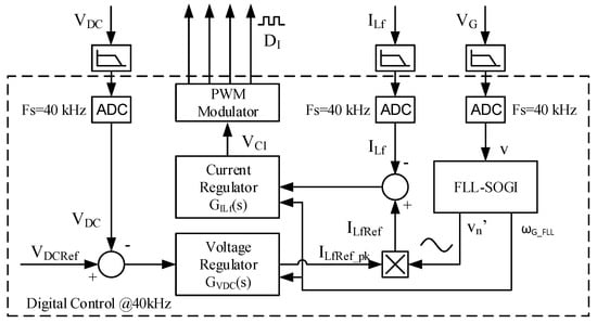 In this research, the implementation of control structures based on second-order generalized integrators (SOGI) [,,,,] is proposed to support the DC-link capacitance reduction of two-stage grid-connected PV inverters with a small number of sensors. On the one hand, it will be shown that SOGIs can improve the dynamic response of the DC-link voltage. On the other hand, the frequency adaptability of SOGI structures will help to reduce the THDi in the case of variations of the grid frequency, even under highly distorted grid voltage conditions.