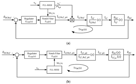Control loop of the DC-link voltage (VDC) with second order generalized integrator (SOGI) notch filter: (a) detailed model, (b) equivalent model.