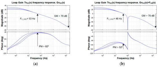 Figure 4b shows the Bode plots of TVDC(s) when the notch filter is used in series with GVDC(s). In that case the value of FC_VDC has slightly decreased (FC_VDC = 46 Hz), getting high stability margins: PM > 52° and GM > 70 dB. The system is also stable, but the attenuation at 100 Hz is higher than 100 dB.