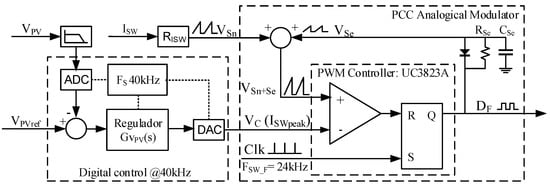 The control structure of the DC-DC stage is depicted in Figure 5. It is composed by an outer digital voltage loop, regulating VPV, in cascade with an analog peak current control (PCC) circuit, which sets the peak value of the current, ISW, through the Flyback converter power transistor.
