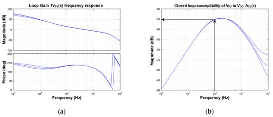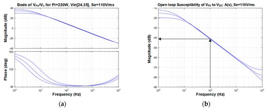 Frequency response of VPV control loop: (a) TVPV(s) loop gain of the VPV control loop and (b) closed loop susceptibility, . VPV = [24, 30, 35] V, PPV = 230 W, Se = 110 V/ms.