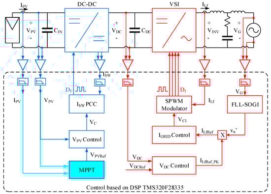 In order to reduce the installation and maintenance costs, the photovoltaic (PV) market requires low cost and reliable systems. Moreover, grid-connected PV inverters must comply with several electromagnetic compatibility (EMC) regulations, some of which limit the distortion of the current injected into the grid (THDi), like IEC EN61000 and IEEE519 [,,,]. Maximum power point tracking (MPPT) algorithms are implemented to optimize the performance of PV systems [,,,,]. Conventional MPPT algorithms use current and voltage sensors to calculate the power extracted from the PV source. Several investigations have focused on reducing the number of sensors in PV inverters when implementing MPPT algorithms [,,,], which has a positive impact on cost reduction.
