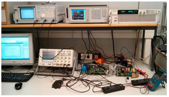 Figure 11 depicts the experimental setup. The laboratory tests have been performed using the two-stage inverter presented in Figure 1. The inverter under test was designed for connecting a single PV panel of 230 W to the single phase grid (230 VRMS @ 50 Hz) and has a DC-link with the capacitance calculated in (1), CDC = 50 µF. The challenge of using such a small value of CDC is to keep a low distortion of the grid current and small transient overvoltages at the DC-link. The control of the two-stage inverter has been implemented digitally in a Texas Instruments TMS320F28335 DSP [] at a sampling frequency (FS) of 40 kHz.