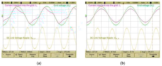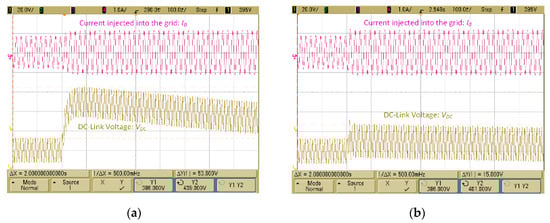 Figure 12 shows the transient response of the DC-link voltage (VDC) and the current injected into the grid (IG) when the PV power steps from 150 W up to 200 W. The results shown in Figure 12a were obtained with a crossover frequency Fc_VDC = 10 Hz, yielding an overvoltage in VDC of 53V from its steady-state value. The response in Figure 12b is obtained with a crossover frequency Fc_VDC = 45 Hz. The response in Figure 12b was close to five times faster and the overvoltage is only 15 V, which represents a reduction of 72%.
