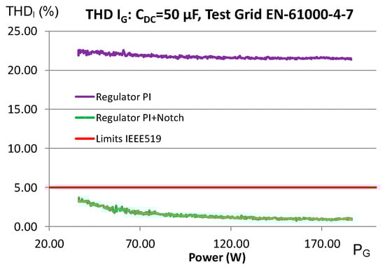 The following tests of the THDi have been performed for values of PG in the range PG = [40, 180] W. The results are shown in Figure 14. The purple trace represents the values of THDi obtained without the SOGI notch FNS(s) and the green trace represents the values obtained with FNS(s). The THDi without notch varies from 21.51% to 22.43%, clearly exceeding the limits of the IEEE519 standard [] (5%), shown by the red line. The values of the THDi obtained with FNS(s) vary from 0.96% to 3.14%, widely complying with IEEE519 in the whole range of PG values. In all the measurements the distortion of the grid voltage is THDv = 1.2%.