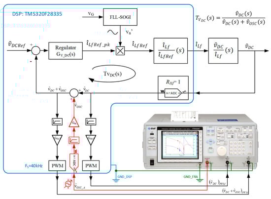 The loop gain TVDC(s) has been validated by means of loop gain measurement procedures [,,]. The setup of the test is shown in Figure 15. An NF FRA5097 frequency response analyzer (FRA) is configured to perform an AC sweep from 2 Hz to 20 kHz. The signal generated by the oscillator of the FRA (vOSC_A) is acquired by the DSP, which carries out the control of the inverter through an internal 12-bit ADC. The acquired signal (vOSC) was digitally injected into the control loop as a perturbation. Both, vDC and vDC+vOSC signals were adapted digitally to be loaded into the pulse width modulation (PWM) unit of the DSP. The offset of the signals was removed through digital high pass filters, and then the amplitudes are digitally adjusted to maximize the resolution of the PWM. The PWM signals (vDC)PWM and (vDC + vOSC)PWM were measured by the FRA. The PWM signals were filtered by the FRA through its internal tracking filter. The loop gain measurement of TVDC(s), shown in Figure 16,was performed at PG = 230 W. The results show the similarity between the experimental and theoretical Bode plots of TVDC(s).