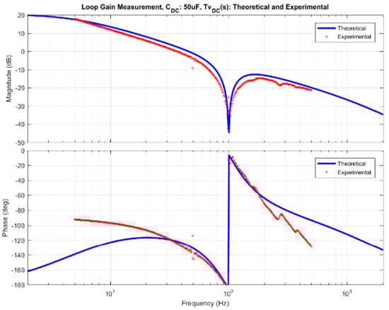 Loop gain frequency response of TvDC(s). PG = 230 W, CDC = 50 μF. Blue: theoretical, red: experimental.