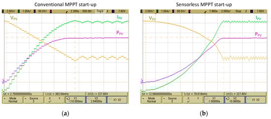 Figure 17 shows the evolution of the operation point at the PV source (VPV, IPV and PPV) from the start-up until the MPP was reached. The conventional implementation was faster (2.75 s) than the sensorless (12.6 s) due to the differences in the perturbation step, but once the MPP is achieved, both implementations continue at the MPP.