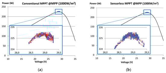 A key factor in the MPPT performance is the accuracy of the PV estimation and the dispersion of the operation point from the MPP along the I–V curve. The results shown in Figure 18 were obtained tracking the MPP of the 230 W PV panel at constant irradiation of 1000 W/m2 during 50 s. The results in Figure 18a correspond to the conventional MPPT algorithm and the results in Figure 18b correspond to the sensorless algorithm. In both implementations, the operation points are very close to the MPP. The power extracted from the PV panel during the tests is shown in Table 4. In order to calculate the MPP tracking performance, the quotient between the average power and the peak power measured in each experiment has been used as a reference, as it is expressed by Equation (18). Although the sensorless algorithm presents a very slight disadvantage (0.06%) in terms of the tracking efficiency, the performance of both methods is almost the same.