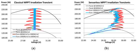 The tracking of the MPP under heavy irradiation transients is shown in Figure 19. The tests have been performed for 50 s following the stages shown in Table 5. The black traces are the IV curve of the PV panel at 1000 W/m2 and 600 W/m2. The blue traces represent the evolution in stage 2, during the reduction of the irradiation, and the red trace represents the evolution in stage 4, during the increase of irradiation.