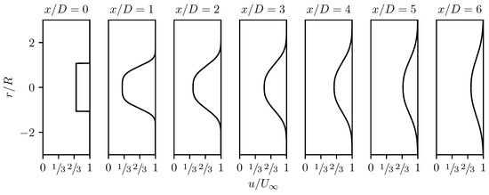 The resulting profiles for the velocity in the wake, assuming , and , are shown in Figure 1. These profiles begin as a top-hat with the expected velocity of , at the rotor disk, where a is the induction factor. Around , the velocity is a smoothed top-hat with in the middle of the wake. Further downstream, the deficit decays, transitioning to a Gaussian by mimicking the potential core region noted in [28].