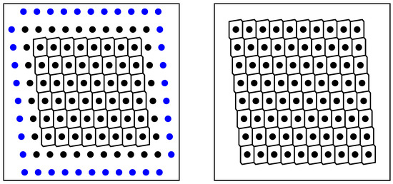 Voronoi tessellation of the Horns Rev wind farm showing wind turbine locations (black dots), ghost point locations (blue dots), and Voronoi cells (black lines). The left panel shows the original tessellation with ghost point projections. The right panel shows the final tessellation with the ghost points removed.