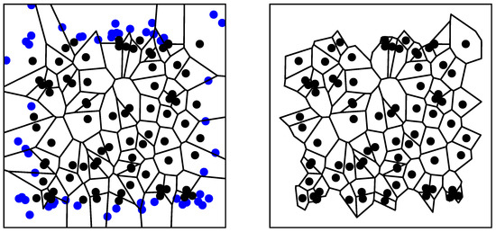 Voronoi tessellation of a randomly-generated wind farm showing wind turbine locations (black dots), ghost point locations (blue dots), and Voronoi cells (black lines). The left panel shows the original tessellation with ghost point projections. The right panel shows the final tessellation with the ghost points removed.