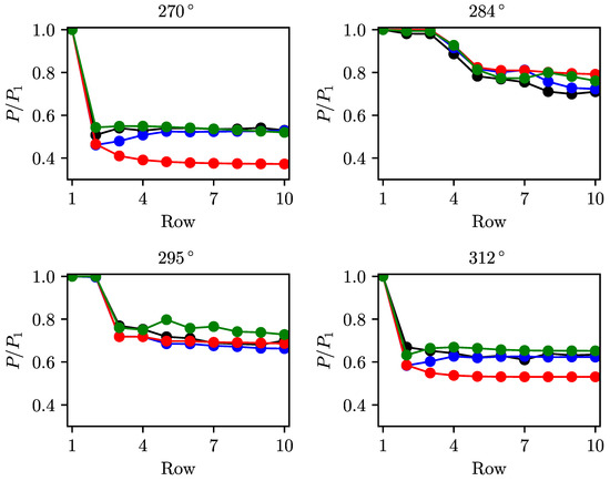 Wind farm power production of Columns 2–4 (counting from the south) at various wind angles from large-eddy simulations (LES) (black), the Jensen model (red), the coupled wake boundary layer (CWBL) (blue), and the present model (green). LES data were digitally extracted from [24].