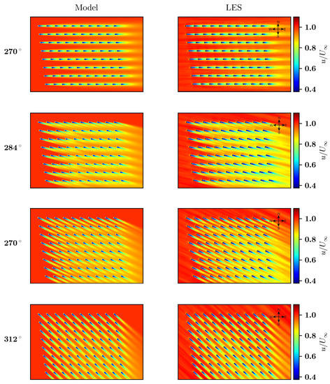 Velocity field of Horns Rev wind farm at various wind angles. Results compare the current model (left) to time-averaged LES velocity fields (right). LES fields reproduced from [44], which is licensed under the Creative Commons Attribution CC-BY 3.0 license.