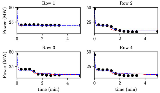 Power production of a wind farm at start-up comparing LES (symbols), the model with linear advection (red), and the model with nonlinear advection (blue). Only the first four rows of the farm are shown.