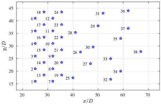 Locations of the 38 turbines in the wind farm simulated in LES.