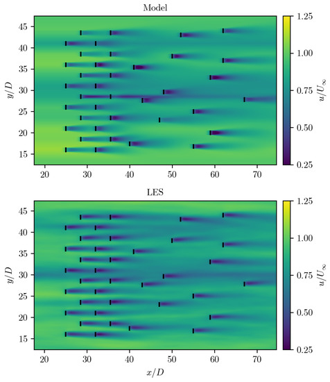 The wind farm power production predicted by the model is compared to the LES, Jensen, and CWBL models in Figure 4. The current model shows good agreement with the LES data for all angles, with particularly good agreement for the wind angle and in the early rows of the farm for all cases. The results are comparable to the CWBL model, but our approach outperforms the Jensen model. Figure 5 illustrates that the flow field obtained is more realistic than that generated by models using simple top-hat or Gaussian profiles (the latter are shown in [21]), due to the use of the wake profile function in Equation (20). In particular, the figures show that the wake profiles transitions from top-hats to Gaussians, and the expansion rate of downstream turbines is larger than the first turbines in each row, as seen in the LES data. As a result, at closer streamwise spacings, we expect the model to perform well compared to actuator disk model simulations; however, actuator line simulations with radially-varying induction factors and small-scale tip vortices will not be fully described by the model at close streamwise spacings.