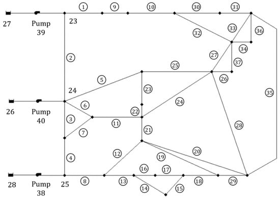 The network studied by previous researchers [11,16,21,22,23] is modified to be the case network. For convenience, only the components number of the modified parts and the pipes number are marked in Figure 2, where three VSPs are used to substitute for the reservoirs with constant water heads.