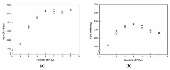 The variation trend of fsum with and without considering PRV cost is indicated in Figure 3. It can be clearly seen that when the PRV cost is not considered, the value of fsum in Figure 3a remains nearly unchanged after a significant increase, but the value in Figure 3c is still rising. When taking into account the PRV cost, Figure 3b presents a trend of declining after rising, while Figure 3d rises first, then becomes generally flat, and finally falls. There is a clear increase when installing a single PRV in both Figure 3c,d. For selecting the number of PRVs, the maximum values are obtained in Figure 3b,d when the number is four and three, respectively. According to Table 1, the optimal solutions both appear when the number of PRVs is four (2829−400 = 2429 RMB/day for PRV-only scheduling and 3877−400 = 3477 RMB/day for joint scheduling). Thus, the optimization results of four PRVs for further analysis is taken later. At the same time, it can be seen in Figure 3 that the fluctuation of each optimization value near the average value is small, and that convergence is acceptable.