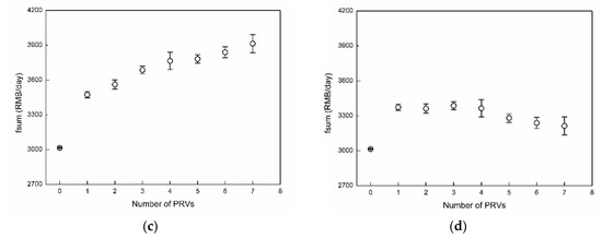 The value of fsum without and with considering PRV cost: (a) PRV-only scheduling without considering PRV cost; (b) PRV-only scheduling considering PRV cost (100 RMB/day for each); (c) Joint scheduling regardless of PRV cost; (d) Joint scheduling considering PRV cost.