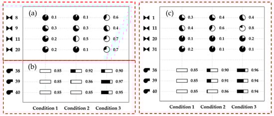 Figure 4 shows the PRV diameter multipliers and VSP speeds under multiple working conditions. Pipe combination (8, 9, 11, 20) is chosen for locating PRVs for PRV-only scheduling strategy, and pipe combination (1, 11, 20, 31) is selected for installing PRVs for a PRV-VSP joint scheduling strategy. The proportion of the white area of the pipe chart in Figure 4 indicates the open degree of a PRV. In contrast, the bar chart indicates the setting of speed of an VSP. It can be found that the setting of the same PRV or VSP under different strategies is different. The PRVs in Condition 1 (the low demand period) are closed more than that in Condition 3 (the peak demand period). The speed of the VSP in condition 1 is lower than that in condition 3. The PRVs’ location for the PRV-only strategy is different from that for the joint scheduling strategy because the VSP can cooperate with PRVs together to manage the pressure.