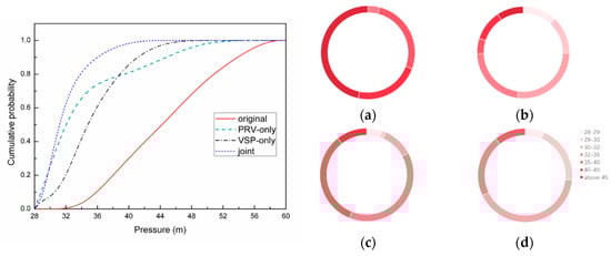 The distribution of nodal pressure before and after scheduling. The left is the cumulative probability distribution curve of the pressure. The right is the pie chart, (a) original, (b) PRV-only scheduling with four PRVs, (c) VSP-only scheduling, and (d) joint scheduling with four PRVs.