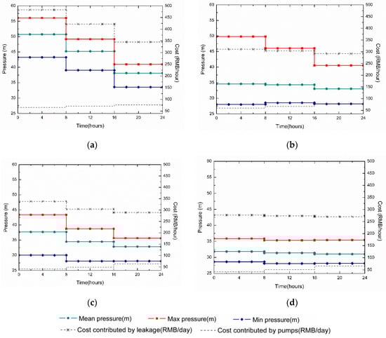 Figure 7 shows the average/maximum/minimum pressure and hourly cost under different optimization strategies. The cost is the actual expense brought by leakage or energy consumption, which is equal to the original cost minus fsum1 and/or fsum2, respectively. Max pressure is the biggest pressure of all the nodal pressure for every time step, while minimum pressure is the smallest one, and the average pressure is the mean value of all the nodal pressure. Regarding the pressure, the decline of maximum pressure for the PRV-only strategy (Figure 7b) is not clear when compared to that of the original network (Figure 7a), while the average and minimum value have a considerable decrease and show stability under the three working conditions. The pressure of VSP-only scheduling is reduced (Figure 7c) compared to that of the original network (Figure 7a). Its max pressure is lower than that of the PRV-only strategy, but its average pressure is higher than that of the PRV-only strategy during a non-peak period (0:00–16:00) and is the minimum pressure during the first eight hours. Joint scheduling achieves the best regulation effect of pressure (Figure 7d). Not only is the pressure lower than the other two, but it is also very uniform under the three working conditions, with a small fluctuation. Regarding the cost, it can be seen that PRV-only scheduling and joint scheduling reduce the leakage cost more significantly and uniformly than VSP-only scheduling. The joint scheduling makes the energy cost slightly higher than the VSP-only scheduling strategy, but still lower than the PRV-only scheduling strategy.
