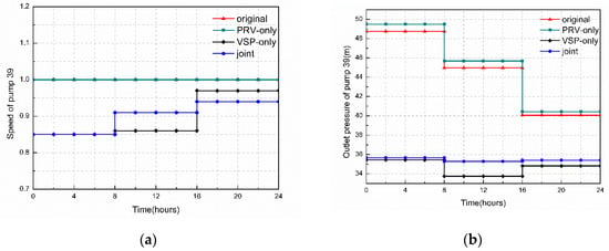 Figure 8 depicts the performance of Pump 39 for the three scheduling strategies. The other two pumps are similar to Pump 39 and are not listed here. The outlet pressure of the PRV-only scheduling strategy has a small rise when compared with the original pressure (Figure 8b) due to the increase in the network’s resistance caused by the PRVs. The outlet pressure is significantly reduced for the VSP-only scheduling. However, it shows instability under multiple working conditions when compared to the joint scheduling strategy, which is unfavorable to the water supply of a water distribution network. Joint scheduling not only makes the outlet pressure significantly reduced, but also presents stability in time. Similarly, the speed of Pump 39 for VSP-only and joint scheduling is lower than that of PRV-only scheduling (Figure 8a). The pump speed of joint scheduling is close to that of VSP-only scheduling during the first eight hours, and then higher during the next eight hours and lower during the last eight hours.