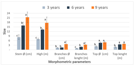 Main morphometric parameters (mean ± St. dev.) of SRWC of poplar at the third, sixth and ninth year of vegetation. Stem diameter (One-Way Anova and Tuckey post hoc test): F = 66.97, df = 27, p < 0.001; height (Welch F test and Tuckey post hoc test): F = 253.1, df = 16.15, p < 0.001; branches diameter (Welch F test and Tuckey post hoc test): F = 8.997, df = 16.1, p < 0.01; branches length (Welch F test and Tuckey post hoc test): F = 71.99, df = 15.39, p < 0.001; treetops diameter (One-Way Anova and Tuckey post hoc test): F = 82.41, df = 27, p < 0.001; treetops length (Kruskal-Wallis and Mann-Whitney pairwise comparisons Bonferroni corrected): H = 21.83, Hc = 21.87, p < 0.001. Different letters indicate statistically significant differences between the groups obtained by post hoc tests applied (p < 0.05).