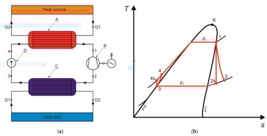 The ORC system operates according to the modified thermodynamic cycle of a classical steam power plant (Clausius–Rankine cycle). The main modification in the cycle is the change of the applied working fluid []. Instead of water, a low-boiling working fluid is applied. The methylosiloxanes (e.g., MM, MDM, MD2M), refrigerants (e.g., R123, R134a, R1234yf, R365mfc, and others), mixtures of refrigerants (e.g., R410A) and other specially designed working fluids (e.g., SES36) can be applied in ORCs [,]. Thanks to the application of the low-boiling working fluid, it is possible to harvest the heat from sources featuring significantly lower thermal properties than those of classical steam power plants (such as e.g., solar heat, geothermal heat, or waste heat, which is carried by flue gases or cooling agents in the industry) []. The temperature of these sources usually ranges between 150–450 °C []. Moreover, the ORC systems differ from classical steam power plants in terms of the system design. The most important differences are: replacement of the steam boiler with a heat exchanger (recuperator or a recovery boiler), replacement of a steam turbine with a Freon turbine (or volumetric expander), and replacement of the condenser with a heat exchanger []. However, the operating principle of the ORC system is the same as in the case of the classical steam power plants. In its basic configuration, the ORC system consists of four main components: the evaporator, the expander, the condenser, and the working fluid pump. The basic configuration of the ORC system is presented in Figure 1a, while Figure 1b visualizes the thermodynamic processes of the organic Rankine cycle in a T-s diagram.