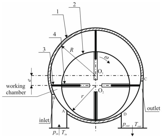 The main machine elements are the cylinder (1) and the rotor (2). The diameters of the rotors and cylinders may vary, depending mostly on the machine power. The rotor is mounted eccentrically in the cylinder on bearings (rolling or slide). Eccentricity can also vary, depending on the machine design. Vanes (3) are placed in perpendicular or inclined slots (4) milled in the rotor. The vanes remain in close contact with the cylinder as a result of centrifugal force, or are pressed to the cylinder surface with the help of other elements e.g., springs or rings. The number of vanes may vary, depending on the machine design and power. The inlet and outlet port edges (A, B, C, and D in Figure 2) are referred to as the machine “steering edges”. The proper arrangement of these edges has a significant influence on the expander operation. This issue is comprehensively described in []. The ideal vane expander working cycle is formed by four ideal thermodynamic processes []: isobaric filling, polytropic expansion, isobaric evacuation, and polytropic compression. The real working cycle is influenced by the following energy dissipation phenomena: underexpansion and overexpansion, pressure losses during filling and evacuation, friction, internal leakages, and heat transfer from the machine surface to the surroundings. The internal leakages proceed between the adjacent working chambers (through the gap between the tip of the vane and the cylinder) and between the rotor and side covers. The external leakages proceed through bearings and seals. A more detailed description of the working principle of a multi-vane expander is presented in [,].