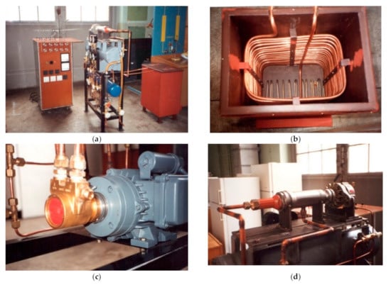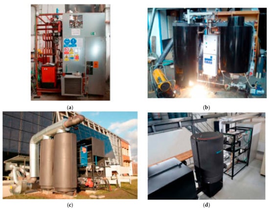 The general views of the ORC test stands implemented at the Czech Technical University in Prague []. (a) First experimental ORC unit; (b) Second experimental ORC unit; (c) WHR (Waste Heat Recovery) demonstration unit; (d) combined heat and power (CHP) biomass-fired 3.5-kW ORC unit. Reproduced with permission from Vaclav Novotny, Energy Procedia; published by Elsevier, 2017.