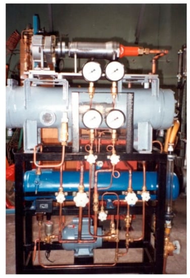 In the mid-1990s, the research project on the applicability of the low-grade waste heat for powering the micro-power ORC systems was conducted at the Department of Thermodynamics of the Institute of Heat Engineering and Fluid Mechanics at the Wrocław University of Technology (Poland). This project implemented a prototype micro-power ORC test stand in the laboratory and adopted the multi-vane air motor as the expander in this setup. A general view of this test stand is presented in Figure 4a (adapted from []).