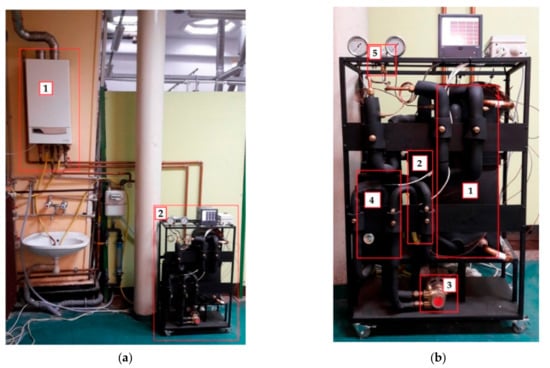 A general view of a micro-power ORC test stand implemented in 2009 at the Wrocław University of Technology. (a) A view of the gas boiler (1) and the test stand (2); (b) A view of the test stand and components: evaporator (1), condenser (2), multi-vane pump (3), working fluid reservoir (4), and multi-vane expander (5).