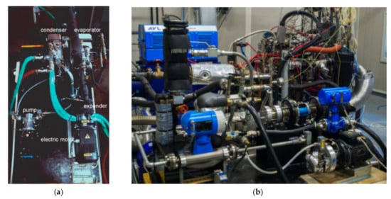 The general views of the ORC test stands implemented at the University of L’Aquila. (a) A view of the test stand introduced in []—Reproduced with permission from Giuseppe Bianchi, Proceedings of the 8th International Conference on Compressors and Their Systems; published by Woodhead Publishing, 2013; (b) A view of the test stand introduced in []—Reproduced with permission from Giuseppe Bianchi, Proceedings of the 33rd UIT (Italian Union of Thermo-Fluid Dynamics) Heat Transfer Conference; published by IOP Publishing Ltd, 2015.