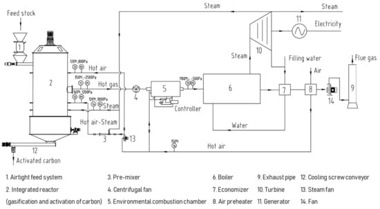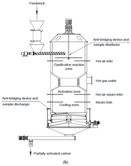 - Zhou, J.; Zhang, S.; Zhang, Y.; Zhang, Q.; Ma, H.; Lu, W.; Zhao, C. A downdraft gasification system for generating electricity and producing heat and activated carbon using nut biomass. Chinese Patent 105505466A, 20 April 2016. [Google Scholar]