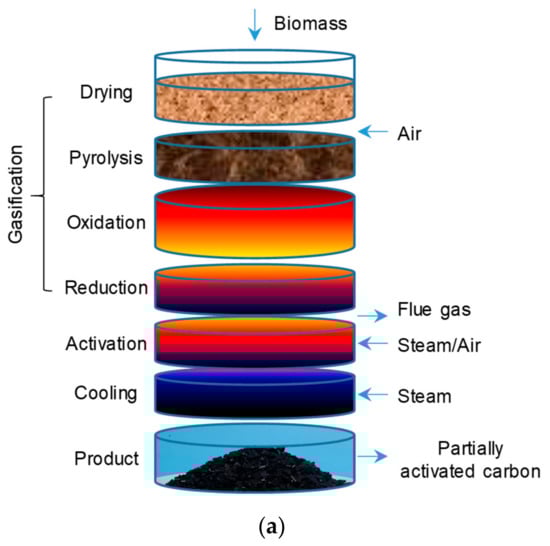(3) Three-stage gasifying agents supply: As shown in Figure 2a, in order to control the reaction temperature and thus the desired products, the supply of gasifying agents was separated into three stages. Air was provided to the top section to gasify the biomass and the volatiles from the initial decomposition of biomass. The air supply, at this stage, must be very carefully regulated to avoid the unexpected temperature increase. Subsequently, the pre-mixed air and steam was supplied into the middle area of the gasifier to gasify and partially activate the biochar. The dilution of air by steam demonstrated to be an effective way of controlling the reaction temperature. The third stage was called the “cooling zone”, where the retained char was further activated and cooled by reacting with steam before moving to the discharging area. The exact flow rates of air and steam were monitored and controlled by vortex flowmeters that indicate both the instantaneous flow rates and accumulative flow at all times.
