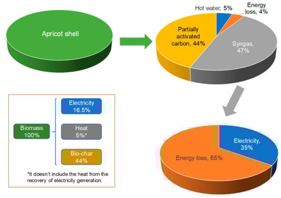 The potential excellent environmental performance is illustrated in Figure 5. It shows that 1.83 t carbon dioxide will be firstly taken from environment in order to form 1.0 t apricot kernel shell containing 50% C. When the shell is gasified, 0.88 t carbon dioxide (0.24 t carbon) will be released into atmosphere, while 0.26 t carbon will end up as solid carbon in biochar or partially activated carbon. Therefore, whenever consuming 1.0 t shell, 0.95 t carbon dioxide from air will be fixed into solid carbon, enabling the system to act as a CO2 absorber.