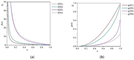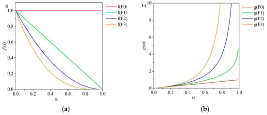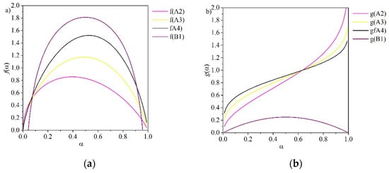 In order-based models (F0–F3), the reaction rate is proportional to α, the conversion degree, raised to a power, which represents the reaction order. These types of models are the simplest of all the kinetic models and are similar to those used in homogeneous kinetics [45]. Figure 2 depicts the functions f(α) and g(α) over α for the order-based methods.