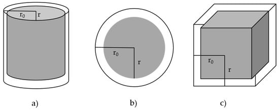 Geometric models, where r is the radius at time t and r0 is the radius at time t0: (a) cylinder (R2); (b) sphere (R3); (c) cube (R3).