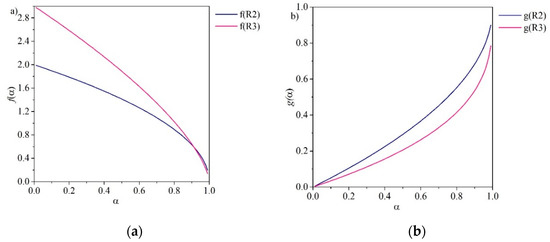 As the mathematical derivation of the geometric models involves the radius of the solid particle, k(T) will be a function of particle size, which will also be the case for the diffusion models (see next) [45]. Reaction functions for geometric models are depicted in Figure 6.