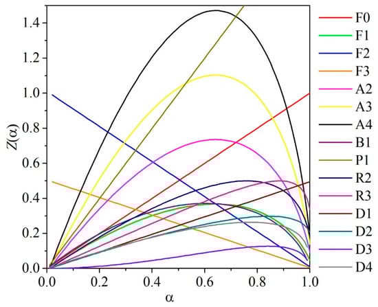 For each of the reaction mechanisms, theoretical Z(α) master plot curves (Equation (25)) can be plotted using the approximate algebraic functions in Table 1 for f(α) and g(α), as shown in Figure 9. A plot of experimental values can be produced with Equation (29). The experimental values will provide a good fit for the theoretical curve with the same mechanism. As the experimental points have not been transformed into functions of the kinetic models, no prior assumptions are made for the kinetic mechanism.