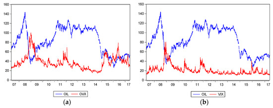 (a) Oil Price and OVX. (b) Oil Price and VIX.
