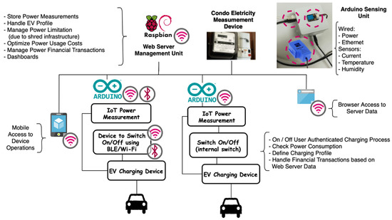- IoT Units. Sensor and power management units that support the interaction with the EV charger, being used to enable or disable it (on/off switch), to measure the amount of power consumed, gather environment temperature and humidity (complementary measures), and to upload all the information to the management unit. Implemented with COTS (commercial off-the-shelf) components, Arduino microcontrollers, actuators and sensors. Depending on the installation requirements, different components can be combined to set up the IoT Unit.