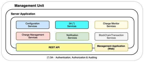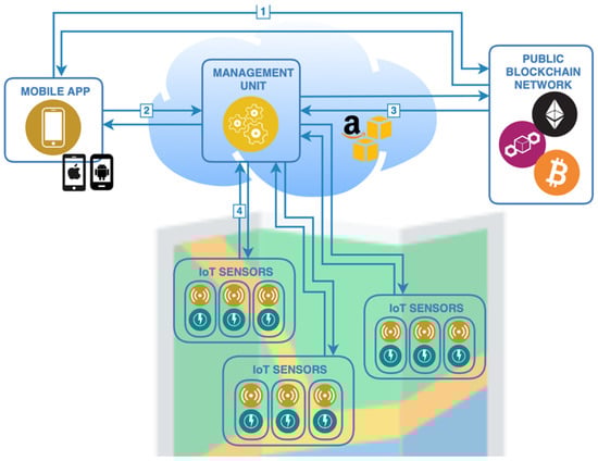Complementary to the setup presented in Figure 1, which is suitable for deploying the solution at the local level, in the context of a single condominium, an equivalent model can be applied to scale the solution to a wider geographical area with an increased number of charging locations. In this sense, Figure 2 expands the proposed model to an IoT architecture that is suitable to explore cloud paradigms, such as Infrastructure as a Service (IaaS) or Software as a Service (SaaS), where the local management unit is replaced by a shared cloud computing platform. Without loss of generality and instantiating the model with existing platforms, the mobile app can be deployed on the Google Play store or Apple’s App Store, the Management Unit can be packaged in a Docker container [], and deployed on the AWS (Amazon Web Services) cloud computing platform, and the Ethereum open blockchain network can be used to support the financial transactions originated by the EV charging operation.
