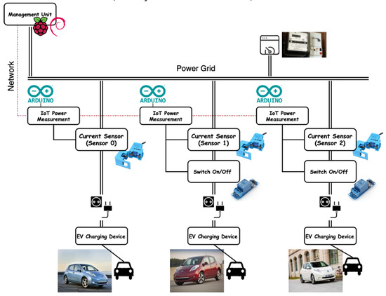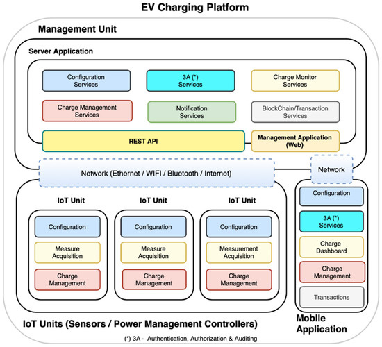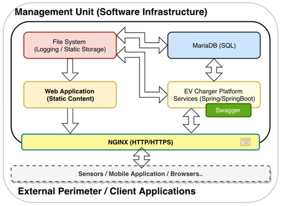 The EV charging platform is composed of the elements presented in Figure 3, whose roles are briefly described below, and the implementation details for each component is detailed in the next section: