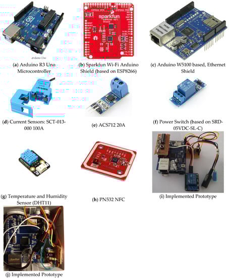Built-In vs. COTS (Commercial Off-The-Shelf) Power Switching: To enable/disable the EV charging devices, we have considered using the SRD-05VDC-SL-C (Ningbo Song Relay Co., Ningbo, China) device (see Figure 4f), which, when connected to the Arduino device, can be used as a switch. A different approach to support this requirement is to use a standard TCP/IP-based (Transmission Control Protocol—Internet Protocol) switch commonly available as COTS on the market.